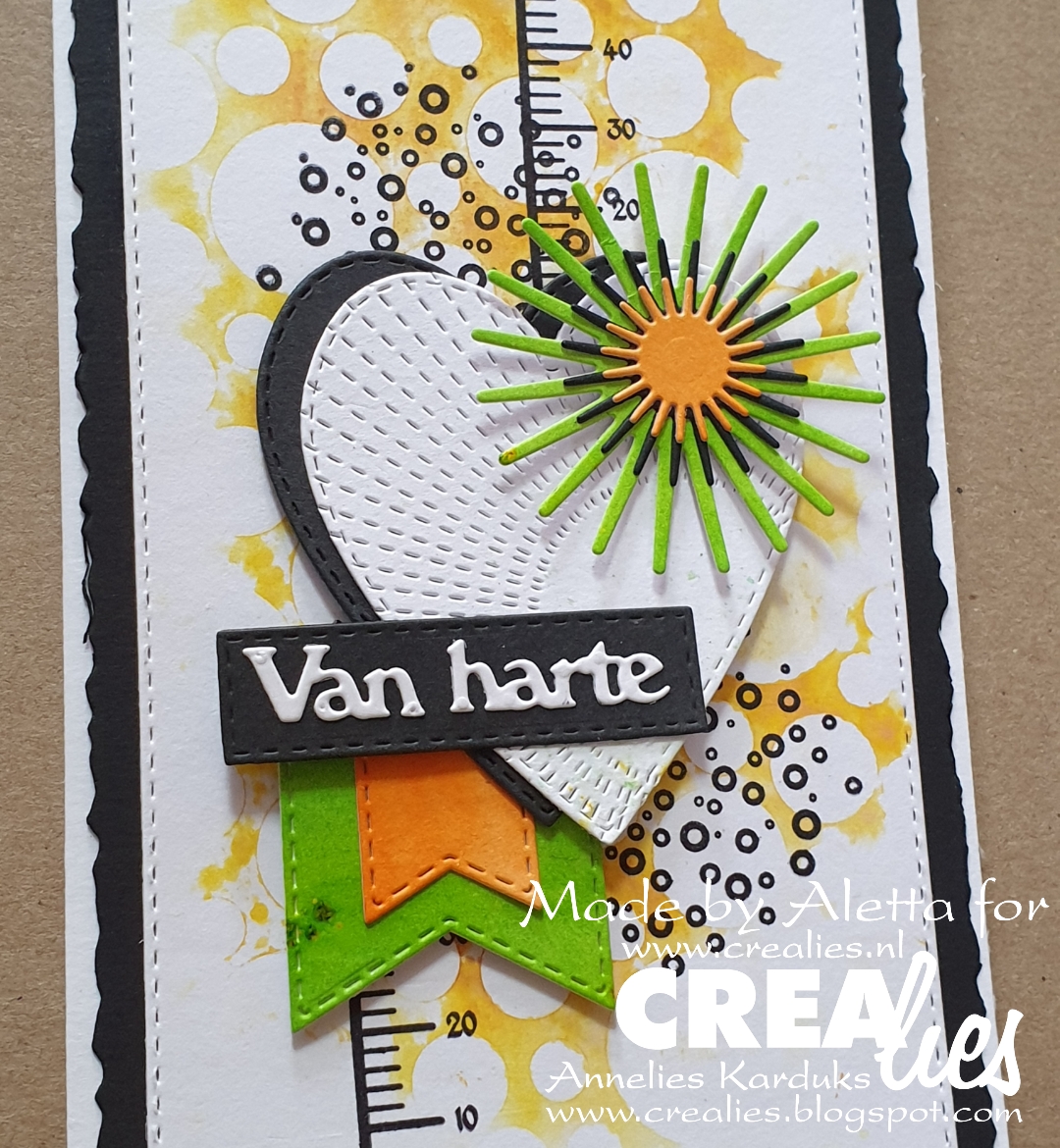Stans de tekst uit wit karton welke je natuurlijk eerst heb voorzien van "Crealies Maak van je stansvorm een sticker". Stans de kleinste stans van Crea-Nest-Lies XXL no. 24 uit zwart karton en plak hier de woorden "Van Harte"op.