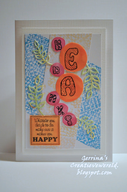 Hier is met de nieuwe Backgroundzz no. 5 op een stuk stempelpapier met blauw gestempeld en op een smaller stuk met zacht oranje en geel gestempeld. De kleine strook is er schuin opgeplakt. De rondjes die overblijven als je de Decorette no. 17 stanst zijn gekleurd met Distress inkt. Daarna de letters erop gedoodeld. Deze op de kaart geplakt. De "mooi gezegd"-stempel afgedrukt en ook oranje gemaakt, plus hier dik foamtape achter gedaan en opgeplakt. De blaadjes gekleurd en opgeplakt. Als laatste dit op wit cardstock geplakt, daar weer een vel foam onder geplakt en dat alles op het mapje geplakt.